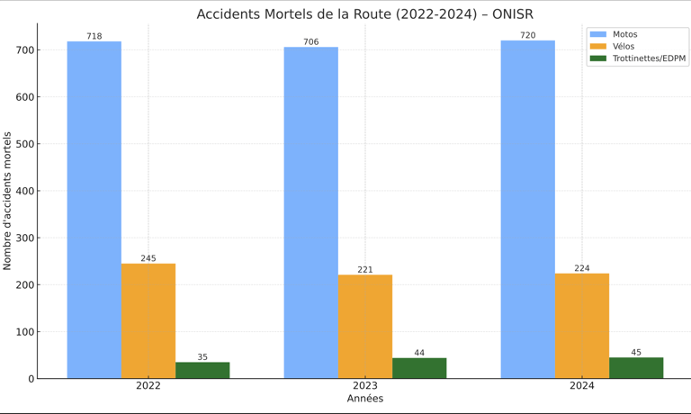 Chaque année, plus de 150 000 accidents de la route impliquent des 2 roues en France. Parmi ces incidents, un nombre significatif est fatal, avec des motos, vélos, trottinettes et EDPM représentant une part importante des accidents mortels. Ces accidents sont souvent dus à un manque de visibilité, surtout lors des trajets de nuit ou dans des conditions de circulation difficiles. Drive To Safe vise à réduire ces risques en améliorant la visibilité des 2 roues et en alertant les conducteurs en temps réel.